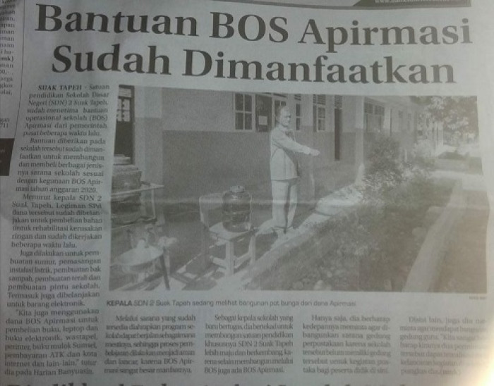 SDN 2 Suak Tapeh, Telah menerima Bantuan dana BOS Afirmasi tahun 2020, Dengan telah mendapatkan bantuan tersbut, membuat SDN 2 Suak Tapeh mnedapatkan Angin Segar. Dengan Dana BOD AFIRMASI tersebut SDN 2 Suak Tapeh yang dipimpin oleh Bapak Legiman S. Pd mengalami perubahan dan peningkatan besar. Baik dalam bentuk Pembangunan, Peralatan dan kelengkapan Sekolah lainnya, seperti adanya pembelian perangkat Pembelajaran (Bukudll..), Penambahan peralatan penujang Pembelajaran baik untuk Sekolah, Guru dan Siswa (Pembelian Laptop, Printer dll..),Pembeliat dan perbaikan pasilitas gedung (Pembelian Tempat mencuci tangan, terali, pintu kelas, membuat sumur, membuat tempat pembuangan sampah, membuat taman Sekolah, perbaikan gerbang sekolah dan pengecoran jalan tempat keluar masuk kendaraan kesekolah)